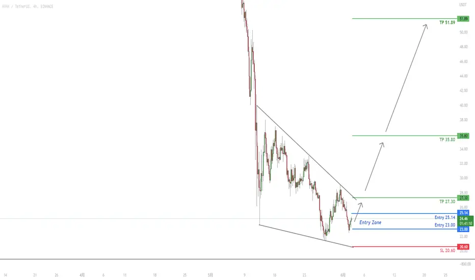 AVAXUSDT 在 H4 上形成了楔形形态,这表明突破后我们可以预期价格会走高。 在 22 被拒绝后,价格已经创出更高的低点,我们可以预期价格继续走高至楔形的上限。