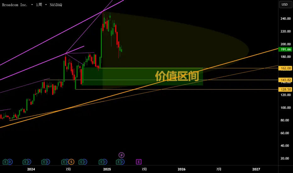 高点回落:2024 年 12 月,股价达到历史高点 $251.88 后开始调整,当前下跌约 24%,进入“价值区间”(绿色阴影区域,$162.08-$191.66)。这一区间是基于历史成交量密集区和趋势线支撑计算的。