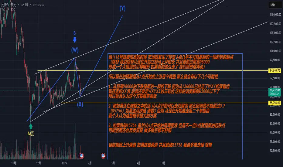 当1/18号跌破前高的时候 市场就发生了转变 A点几乎不可能是新的一段趋势的起点 (除非 我说除非从现在开始立刻马上开始长 并且要超过前高98000 形成一个大级别的引导楔形 如果真的这么走了 我们到时候再说)