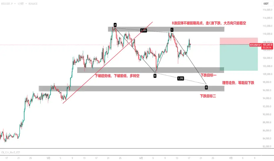 比特币看10w下破,B浪反弹不破前期高点,走C浪下跌,大方向只能看空