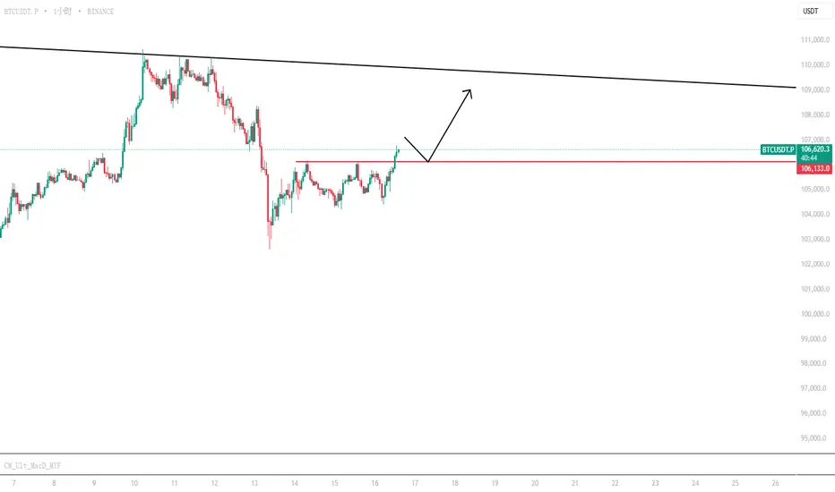 等待回踩105800-106200,观察支撑情况,不破可以考虑低吸做多,目标位108000-109500