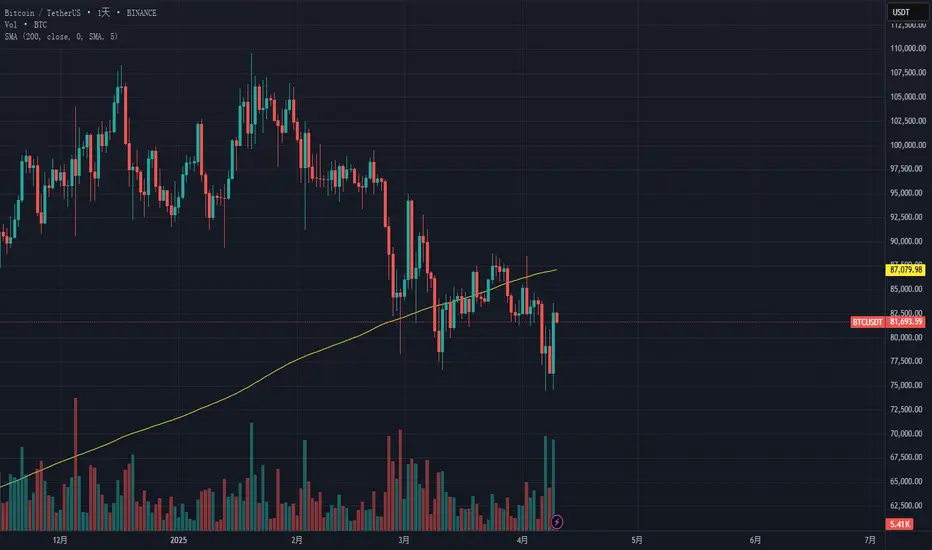 由于本次互惠关税中国给予反抗,特朗普直接增加50关税,市场也应声下跌,最低下跌低点在74578位置,而我们布局的多单也是被止损,随后特朗普又宣布对其他国家暂停新关税90天来让中国服软,大饼也应声反弹,反弹到达了我们目标区间,这单有点可惜,拉升前被市场扫出来;对于关税战,目前已经进入到白热化,特朗普第一任上任时就对中国开打贸易战,但这么多年过去,之前35项被卡脖子的关键技术,目前中国已经攻克27项,现在中国的地位是不允许我们去妥协的,中美贸易战对两国市场经济肯定是有一定的影响,目前对中国的关税是125%,中对美也是同等,继续去追加关税的机会应该不会很大,最后结果要么就是和谈,那我就是降低关税,这些对于市场来说属于利好,我们时刻关注市场消息面就好;