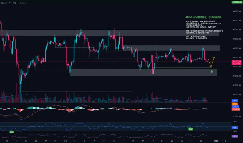 策略: 等待回踩箱体下沿(86k附近)出现止跌信号后尝试短多,目标看回箱体中轴。