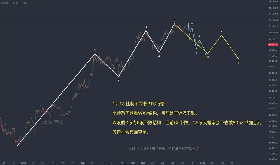 12.18 比特币价格今日行情:比特币目前下跌到了86,000附近,从126,272这一线开始的下跌,,这是一个完整的五波下跌结构。目前可以确认的是,第四波已经结束,市场已经进入到第五波的下跌过程当中。按照正常的结构推演,第五波的下跌幅度,是有较大概率需要去跌破80,537这一关键低点的。