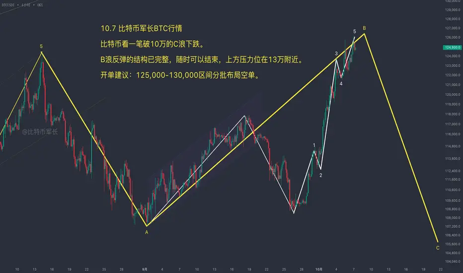 10.7 比特币价格今日行情:比特币在昨天继续上涨,再次突破新高,最高到达 126,208 一线。在昨天的分析中,我们就讲过,上方的压力位已经临近,从小级别的结构来看,随时都有结束的可能性。因此,我们目前采取的是 分批布空的策略,并非一次性重仓。预计在当前区域上下 4%—5% 的波动区间,是合理的分批布局范围。