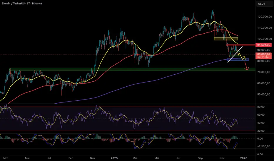 Sollte die grüne Support-Linie nicht halten, steigt die Wahrscheinlichkeit deutlich, dass der Kurs erneut die 800er EMA im Daily-Chart anläuft. Diese Zone ist technisch hochrelevant. Bringt sie – wie beim letzten Test – keinen stabilen Support, rückt ein tieferer Rücksetzer in Richtung der 70.000er-Zone in den Fokus.