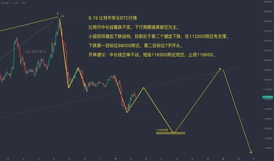 8.19 比特币价格今日行情:比特币目前在117,000一线,昨天晚间走出了一笔反抽。整体的大结构依然维持8月2号的中长线看法不变,这一笔五浪走完后,我们的第一目标位依然是98,000左右。所以中长线的空单,不管是前面顶端布局的,还是后面追进去的,依然保持不动。