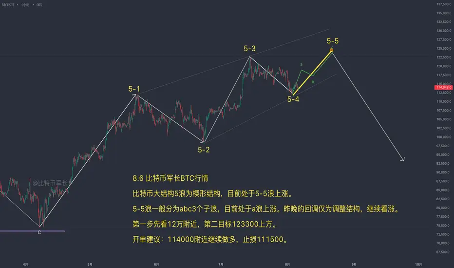 8.6 比特币价格今日行情:比特币昨天经历了一波健康的小幅回调,整体走势仍在既定节奏中,没有偏离我们之前的判断。当前结构依旧维持在自74,457以来的上升楔形之中,目前正处于第五浪上涨阶段,而第五浪本身还包含三个小浪,现在属于其中的第一浪,昨晚的小幅回调,很可能就是第一浪里的二浪调整,当前行情有望进入第三浪的发力段。