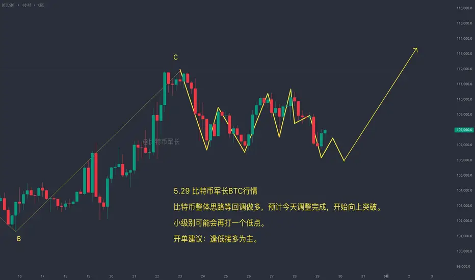 BTC 5.29 比特币价格今日行情:目前比特币回撤到了107,000附近。现在五浪还没完全走完,但已经在尾声阶段了。它可能在这个位置震一震再下打一笔,也可能直接在这附近完成,不管哪种情况,整体都已经临近调整末端。