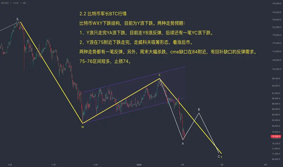 从结构上看,自126,000美元开始的W-X-Y浪型中,当前已确认处于Y浪下跌。Y浪存在两种潜在目标:短期可能在75,000美元附近(W浪的0.618)结束;长期则可能走等长结构,反弹后仍需再探新低。