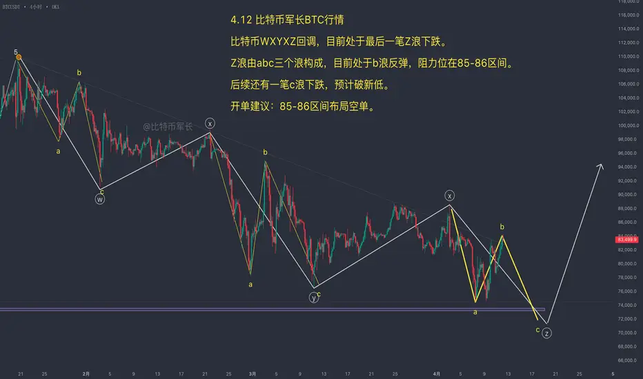 综上分析,比特85-86是比较明确的阻力区,做单思路仍然是背靠此区分批开空布局Z浪中的C浪下跌。