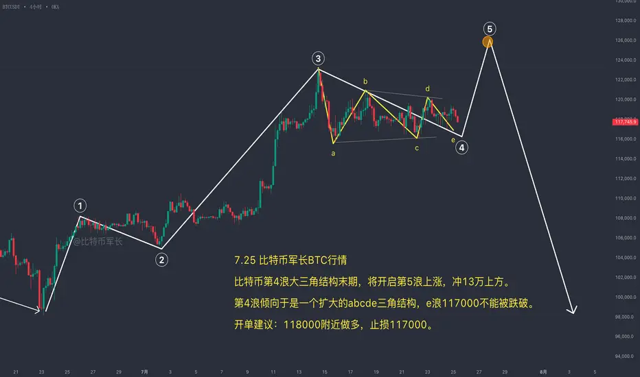 综上分析,第4浪震荡结构我们选择了按大三角结构做单,那就再坚持一天,4浪震荡末期,行情随时启动;如黄色路线则行情已启动昨天是5-1浪,目前5-2浪回调,后面是5-3浪上涨;如白色路线就是三角的E浪扩大震荡,E浪再震个三角。