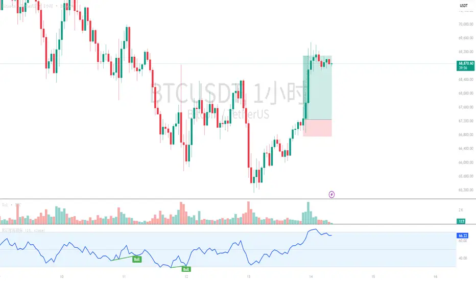 2. 稳健低多(等待回踩):这波反弹根基不牢,直接上攻难度大。更稳妥的做法是放弃追高,耐心等待回踩关键支撑。重点关注68000(首次回踩)和67000(深度回踩)两个位置的企稳信号(如1小时图出现pin bar、晨星等看涨形态,或RSI再次从50附近拐头向上)。在此位置企稳后做多,止损放在支撑下方300-500点,目标看向69000、69500。