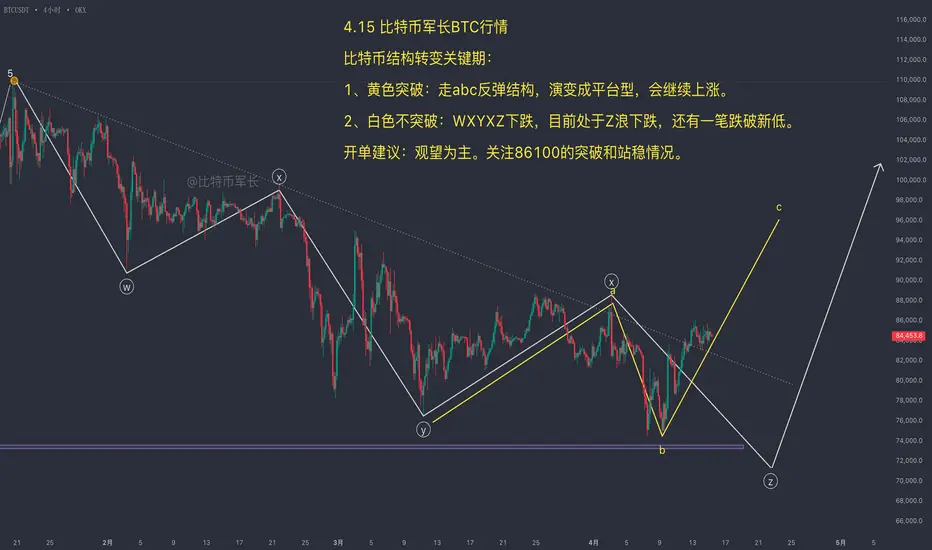 不过目前的关键点就在这儿,现在的价格就在阻力位附近反复磨,如果说它磨破了上去,那结构就变了,原本我们期待的三笔下跌结构就不成立了,就有可能变成平台型的ABC结构,也就是说,这波调整就已经结束,行情要重新走强了。所以目前这个位置特别关键,既可能开启新一轮下跌,也可能直接突破往上走,变成震荡后的拉升。