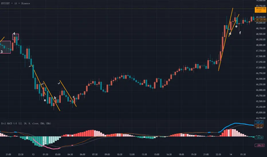 After point e, the pullback (area f) showed progressively smaller bearish candles — a sign of weakening selling pressure.