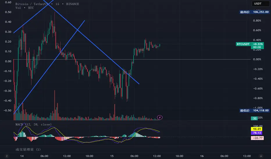 BTC在15分钟周期上已经突破下跌趋势线阻力,但从更大周期(4小时、日线)来看,仍然处于震荡区间中,并未走出明确方向。
