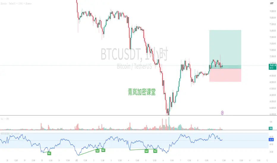 2. 稳健做法:等待方向明确突破。如果价格放量站稳72500以上,可以跟进多单,目标看向74000、76000。如果有效跌破69800(尤其是收盘在4小时图下),则考虑反弹做空,目标68000。