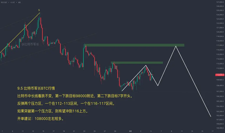 在8月30号我们更新过,中间会有一笔反抽,目前已经到达112-113的小阻力位,这里前面我们也在靠近112做过短空,并且昨天止盈掉了。从现在的走势来看,继续往上冲到116-117的概率正在增加。如果中途有回调,比如能回撤到108附近,可以考虑再做一笔短多,然后期待它突破112-113,去到116-117区间。