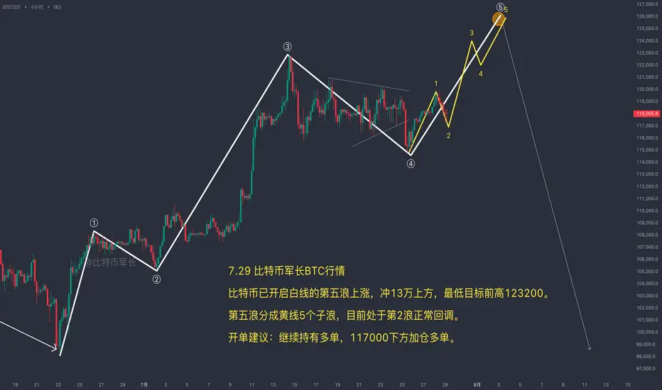 如果这波能回调到117,000下方的位置,可以第二次加仓,这边性价比很高,是个值得重点关注的区域。所以整体方向没变,仍然是看涨,这一波下跌只是二浪回调,回调结束后还会继续往上走,目标还是看第五浪上行。