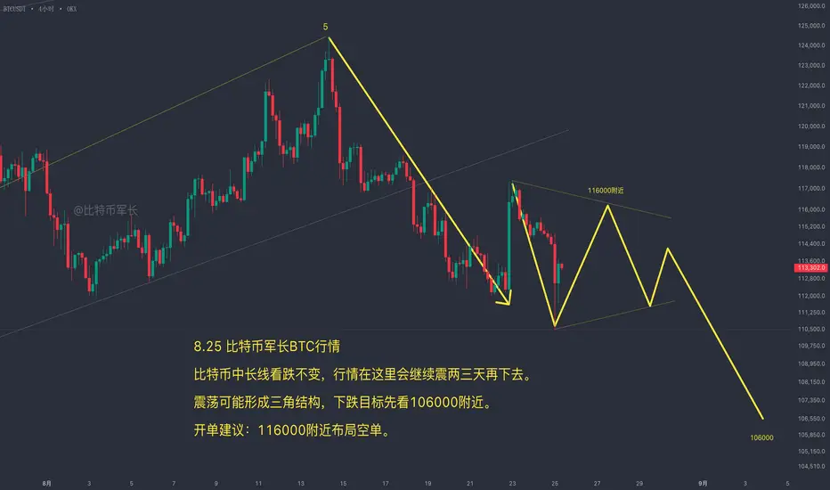 短线的结构来看,比特币从124,545下跌之后,走出了大幅反抽再快速下杀的节奏,这里大概率不会直接破下去,而是可能先走一个震荡三角,再往下破。也就是说,目前阻力和支撑都已经形成,价格可能在这个区间反复震荡,等形态走完再选择方向。所以短线操作要谨慎,耐心等反抽116–117一线,这可能是最后一次上车空单的机会。