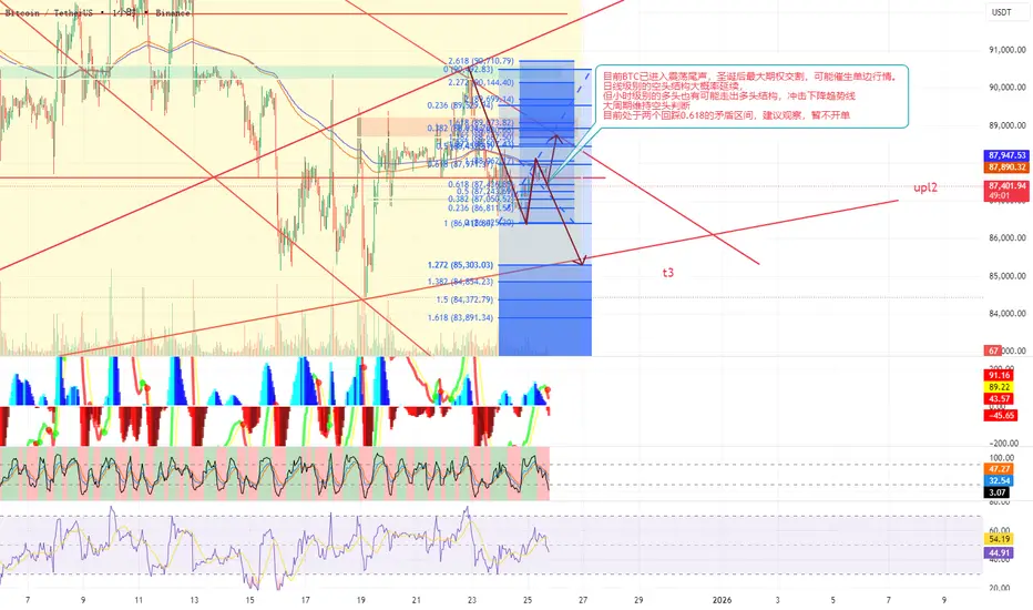 BTC处于第三阶梯日线级别震荡区间空头结构回踩和小时级别小多头回踩的两个0.618矛盾区间,之前博弈回落空单止盈离场,目前耐心等待,开心过节。