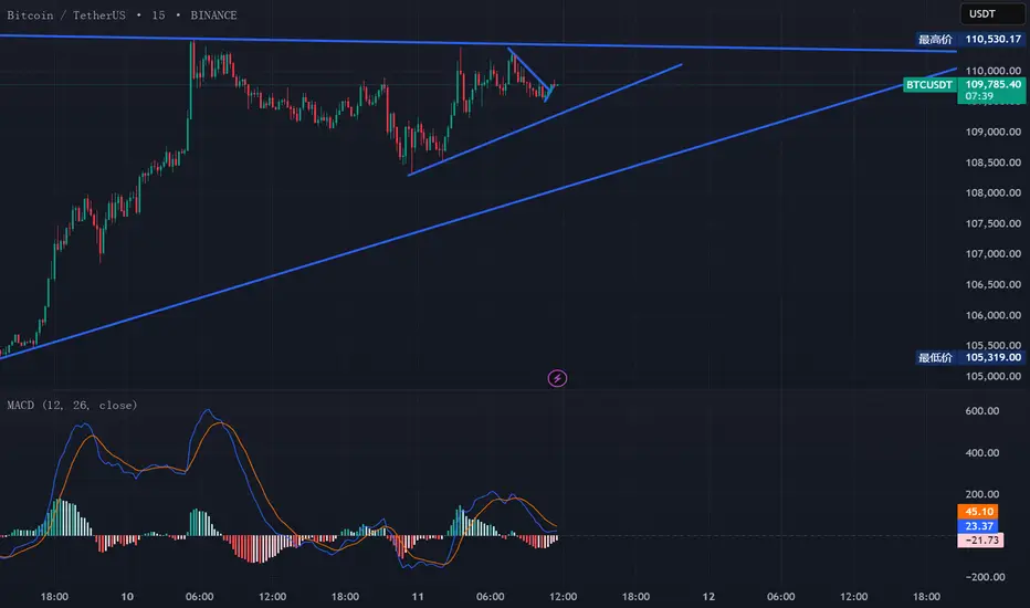 目前价格在 109600 附近横盘整理,1h 和 15min 多次纠缠,考虑到现在是上午低量时段,这种走势是合理的。