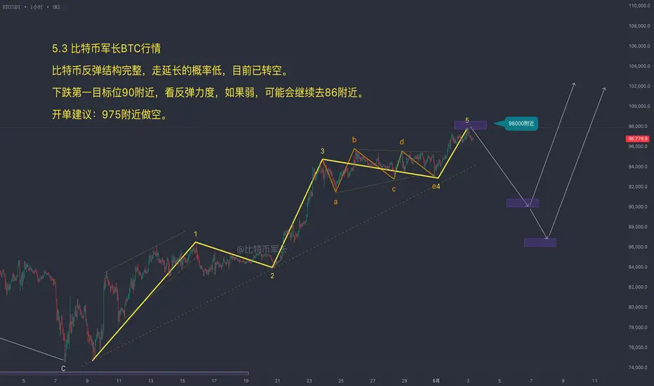 综上分析,74578到97865作为反弹的第一段行情大概率已结束;接下来进入调整期,盘整第一目标位在9w附近,第二目标位在86附近;震荡行情一段一段的做,预计在9W附近止盈空单,然后再准备下一单,时间上估计得震7天以上,保持耐心吧。