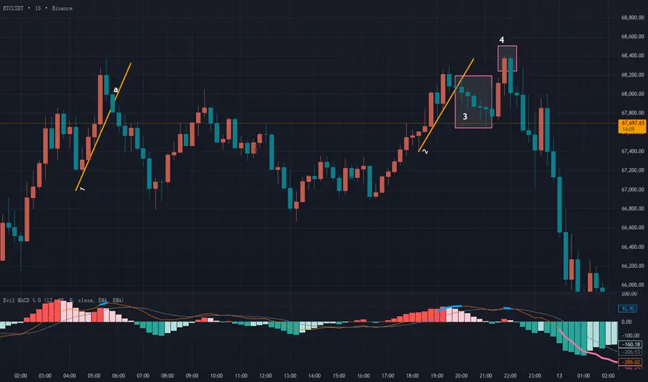 The key question is whether point a can be considered a multi-to-short structural reversal. There is no fixed answer. Objectively, it is indeed a breakout. Point a is a solid candle with almost no wick, and it does not land exactly on the trendline—it clearly exceeds it. However, we also notice a previous bullish candle that is more than twice the size of point a’s bearish candle, indicating that the downward momentum at a is not yet very strong.