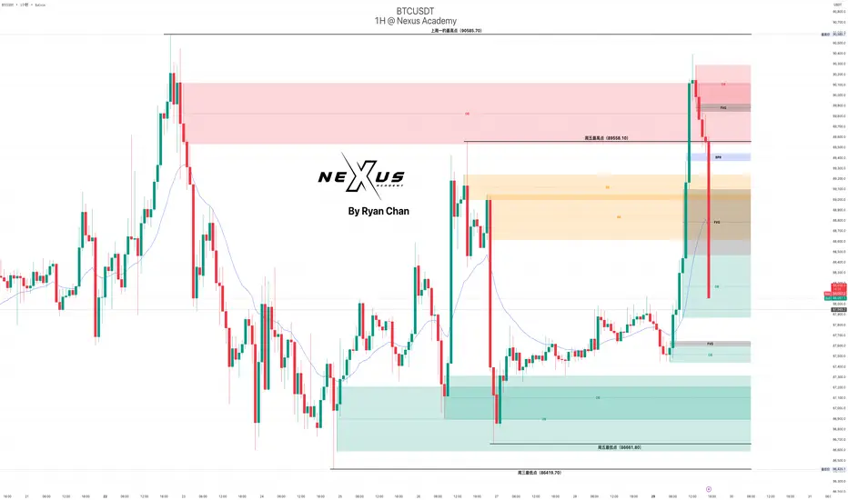 BTCUSDT 价格于 90K 上方出现明显波动,并迅速回落至前期结构区域。该走势更像是高位流动性释放后的结构回踩,而非趋势方向已经明确的延续或反转。