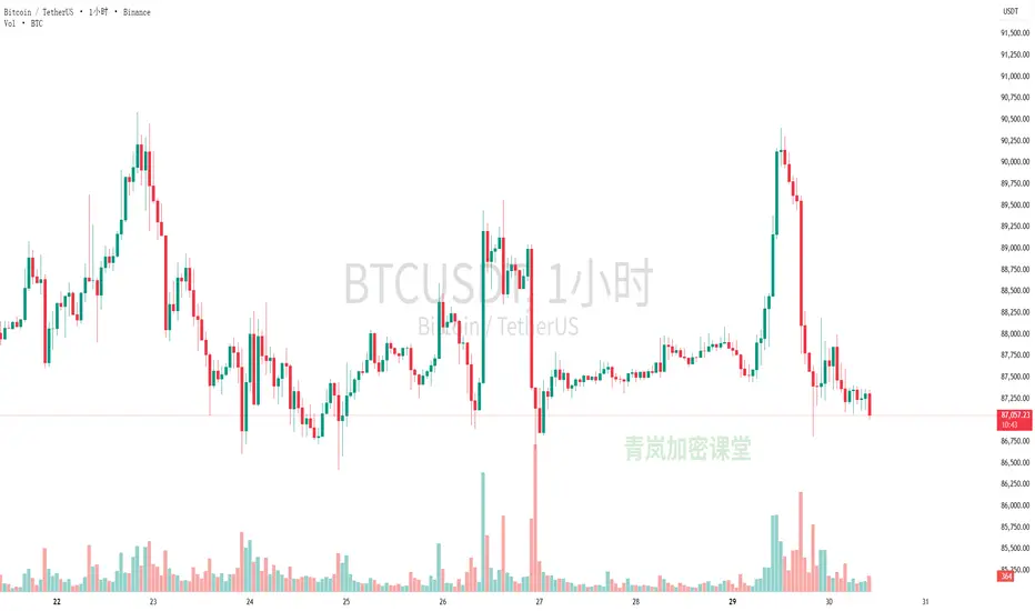 短期阻力位:87300-87400美元(15分钟/1小时图上最近的整理平台和MA5/MA10附近),再往上是87600-87700美元(之前的短期支撑,现在转为阻力)。