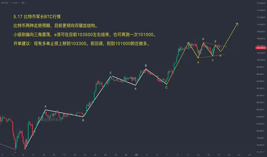 综上分析,小结构偏三角震荡,e浪可在目前位置左右结束,也可以再测一次101000左右,所以设个小止损,如下破则到101000附近再接了。