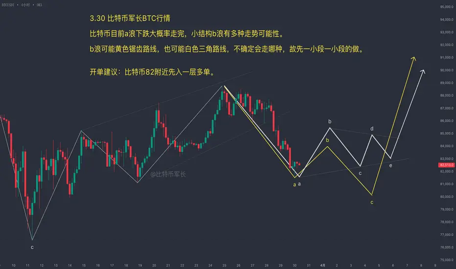 当前的下跌可以视为一个三浪下跌的结构,现在是第一浪下跌,可能会有反抽后再进行第二浪,最终完成ABC下跌。大级别来看,这里是一个更大的ABC调整,当前的b浪还不确定是否会以简单的ABC完成,还是可能发展成一个更复杂的三角形震荡。如果b浪选择走三角,那市场可能会震荡更长时间,导致c浪的启动点更加难以预测。