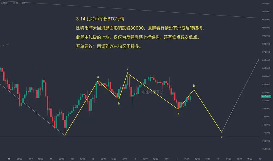 综上分析,昨天因消息面影响跌破了80000,意味着行情没有形成扩展趋势结构。此笔中线级的上涨仅仅为反弹震荡上行结构,预计回落到78-76区间接多。