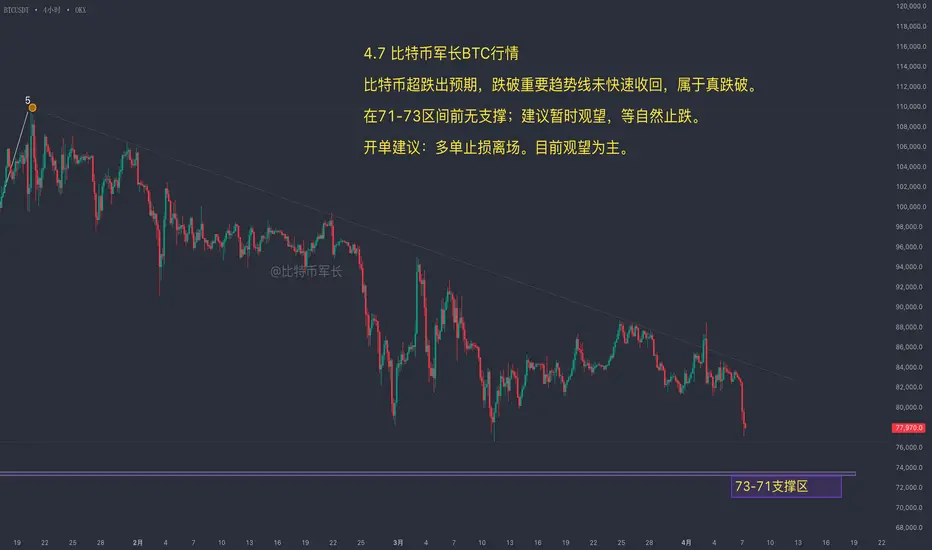 一旦趋势线被真实跌破,就不能轻易再去做多了,因为下方真正的支撑区间已经下移到了73,000至71,000一带。除非行情能够迅速收复失地,重新站回趋势线上方,否则极有可能继续下探这个区间。