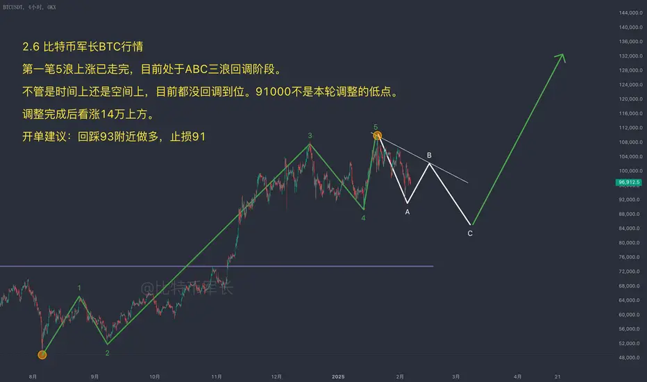 目前比特币在96,000左右的位置,整体行情还处于牛市中期的盘整阶段,盘整结束后会继续走牛。之前从48,888一路上涨到11万,完成了第一波五浪结构,随后进入了回调。目前可以基本确认,这一波五浪的上涨已经结束。按照预期,这次回调大概率会来到8万附近,然后再次开启牛市行情。