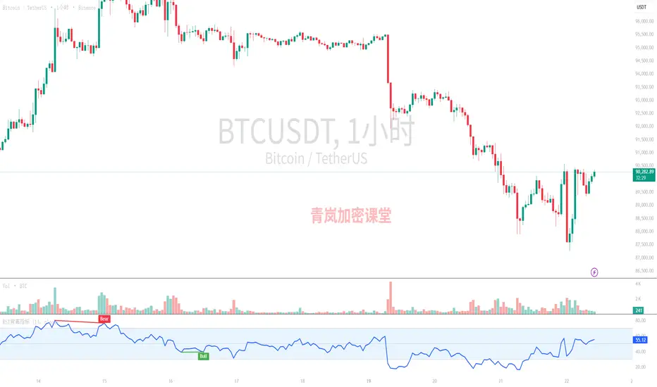 拉长到1小时图,咱们能看到BTC在经历了一波从93000跌到87000的下跌后,近期的K线开始收阳,价格回到了90000附近。MA均线系统虽然整体上还在一个偏空的区域,但MA5(89899)和MA10(89673)已经向上交叉,并且MA5甚至站到了MA20(89370)上方,这是一个积极的信号,说明短线的抛压有所缓解。MACD指标DIF线也刚刚从DEA线下方金叉,MACD柱状图从绿色转为红色,这同样支持了短线反弹的判断。RSI也从极度超卖的16.7回升到了54.93,说明市场情绪有所修复。