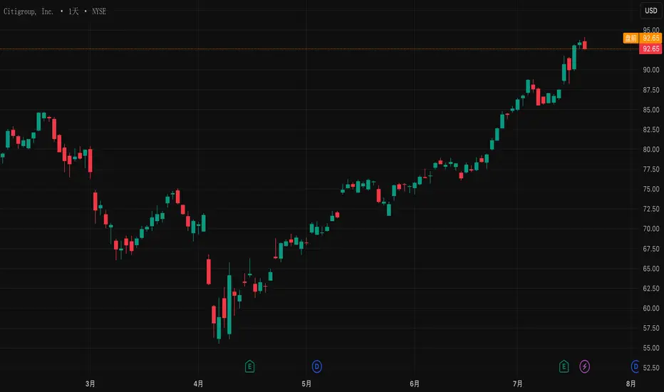技术面上,花旗股价已推升至新一波趋势高点,且伴随放量,形成坚实的上升趋势线。不过,由于 RSI 进入超买区,短线交易者可能会观望回档机会,等待风险/报酬更佳的切入点。若价格能稍作整理或拉回,将有助于建立更具吸引力的进场条件。