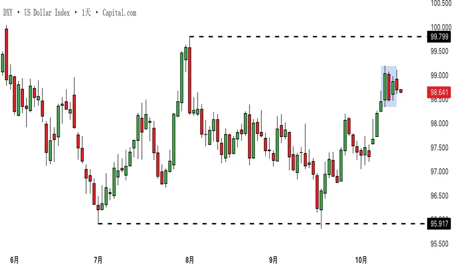 美元暂时止步。在美联储于九月降息后美元转强,如今美国美元指数(DXY)已连续出现两根「内部日」K 线,显示波动性暂时收敛,市场正在等待新的催化因素。由于美国政府停摆导致关键经济数据延迟公布,市场目前更多依赖情绪而非数据驱动。上周美元的强势主要来自日元疲弱,而非美国本身的经济信心。