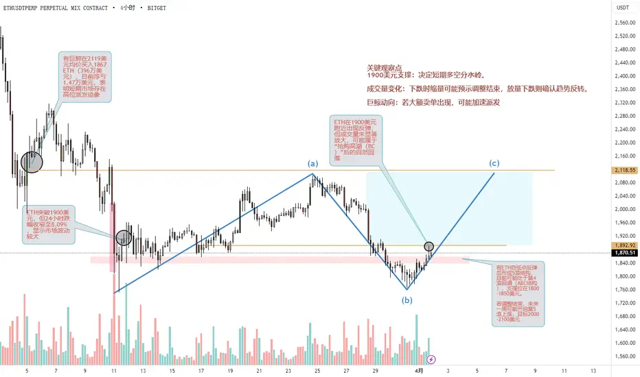 条件:假突破1900后,ETH跌破1900美元,放量下行。