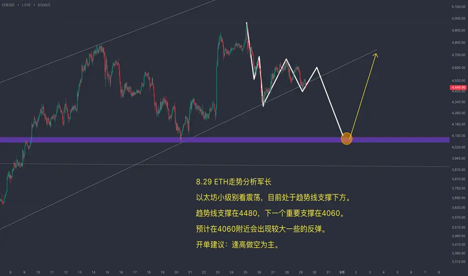 以太坊小级别看震荡,目前处于趋势线支撑下方。