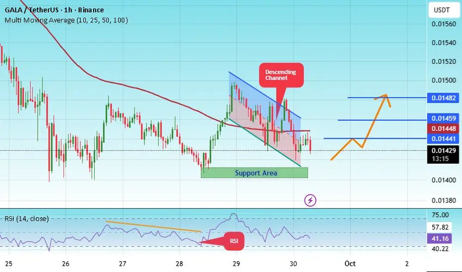 There is a major support area in green at 0.01408, which represents a strong support point.