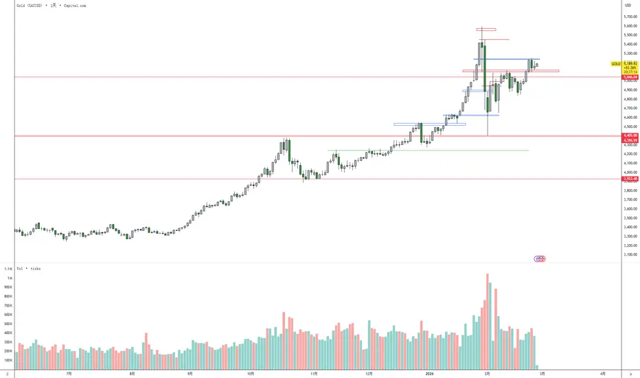 上周末中东局势骤然升级,美国和以色列对伊朗发动军事打击,导致伊朗最高领袖身亡,伊朗随即宣布封锁霍尔木兹海峡。该海峡承担全球20%原油海运,中断风险直接威胁能源供应,市场恐慌情绪激增,黄金作为传统避险资产被集中买入,继上周五行情,黄鱼开盘大涨黄鱼虽小有回落,但市场基本面情绪激发,黄鱼单边拉升,极端情绪是无法用技术面去理解的,从日线表现来看,市场情绪周五晚间就开始激发了,周五行情收高,市场哆头强劲,结合市场基本面,中短期调头做哆为主,关注哆头延续表现,以及美伊谈判的最新进展,若战争能快速得到结果,形态上行情只是去测试前期高点,想恢复趋势还需要更多的证据