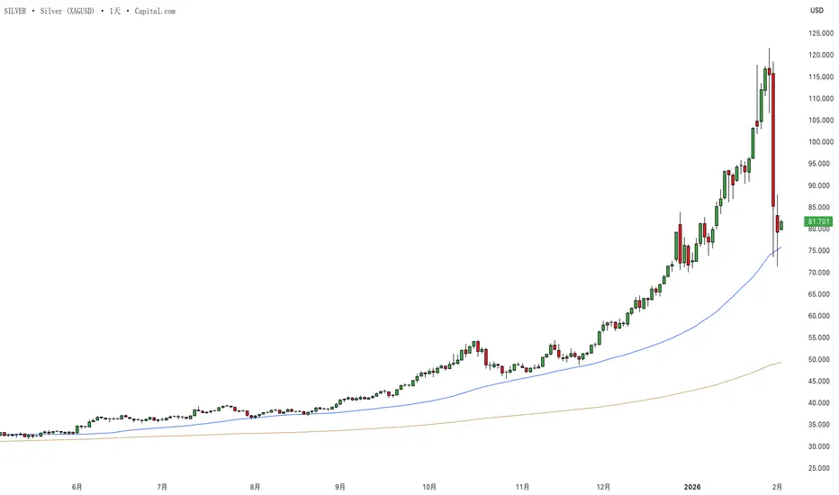从白银的日线 K 线来看,目前走势几乎可视为教科书级别的趋势末端情境。2025 年大部分时间,白银维持稳健而持续的上升趋势;进入新年度后,涨势明显加速,近乎指数型推进,吸引了大量追高的末端买盘。