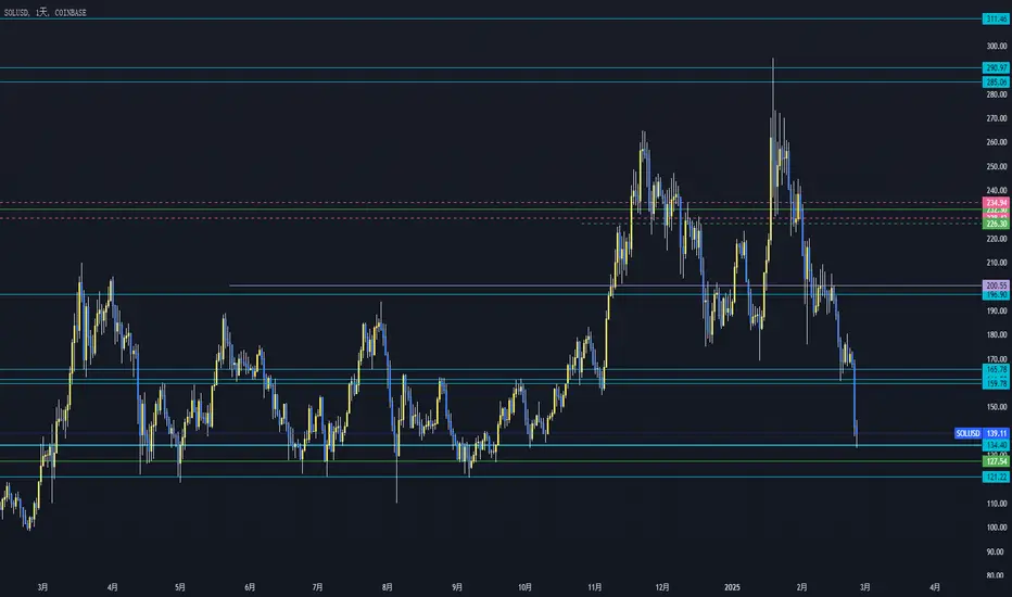 SOL从幅度来说调整已经非常充分了,当前已经进入了前期密集盘整区域底部范围,121/127/137范围,任何位置都可能撑住价格,短线下跌幅度速率已经无法持续,昨天的大阴线接近于收尾状态,往后可能也最多就是假突破,103/108范围还存在极强支撑,向下没空间,但SOL要想再度反弹,可能还需要很长时间。