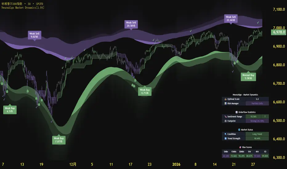关键阻力:6958–6983(SPX)阻力区已被触及。这是一个重要阻力位,同时也是对角线第 5 浪(W.5)的目标结束区,警告周线,甚至月线高点可能已经完成。