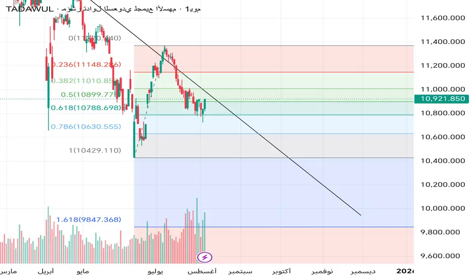 على فاصل اليوم فالمؤشر العام بعد يومين من الإيجابية يتجه نحو اختراق الترند الهابط وفي حال اخترق هذا الترند فسيتوجه بحسب تصحيحات الفيبوناتشي نحو 11,000 نقطه، وفي حال تجاوزها ، وأغلق أعلى منها فسيذهب نحو أهداف أعلى، ولكن الأقرب أنه سيبدأ في التصحيح منها نحو 10.921 نقطة.