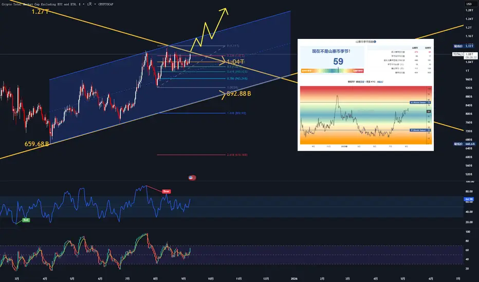 山寨总市值上升通道成立 0.618多次踩稳 静待突破三角线站稳后再做布局 现在可以挑一下合适的标底现货进场