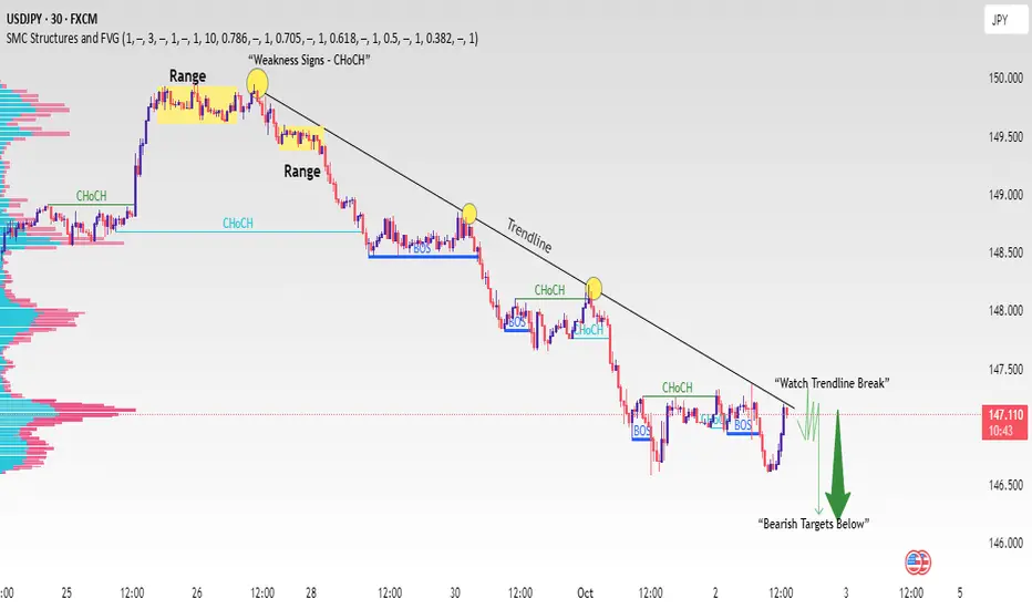 The market has been respecting an ascending trendline, creating higher highs and higher lows. However, recent structure shows multiple CHoCH (Change of Character) patterns, signaling that bullish momentum is fading.