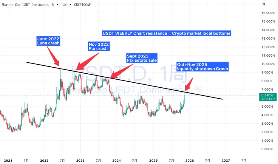 USDT Dominance 每次到达周趋势线阻力,都变成为市场底部.