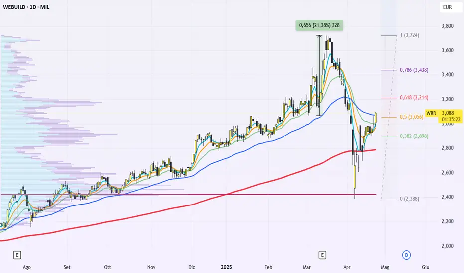 Aggiornamento su WebuildCome da analisi precedente, raggiunto il primo obiettivo a 3,214€ (+4,80%), in corrispondenza del livello di ritracciamento 61,8% di Fibonacci.